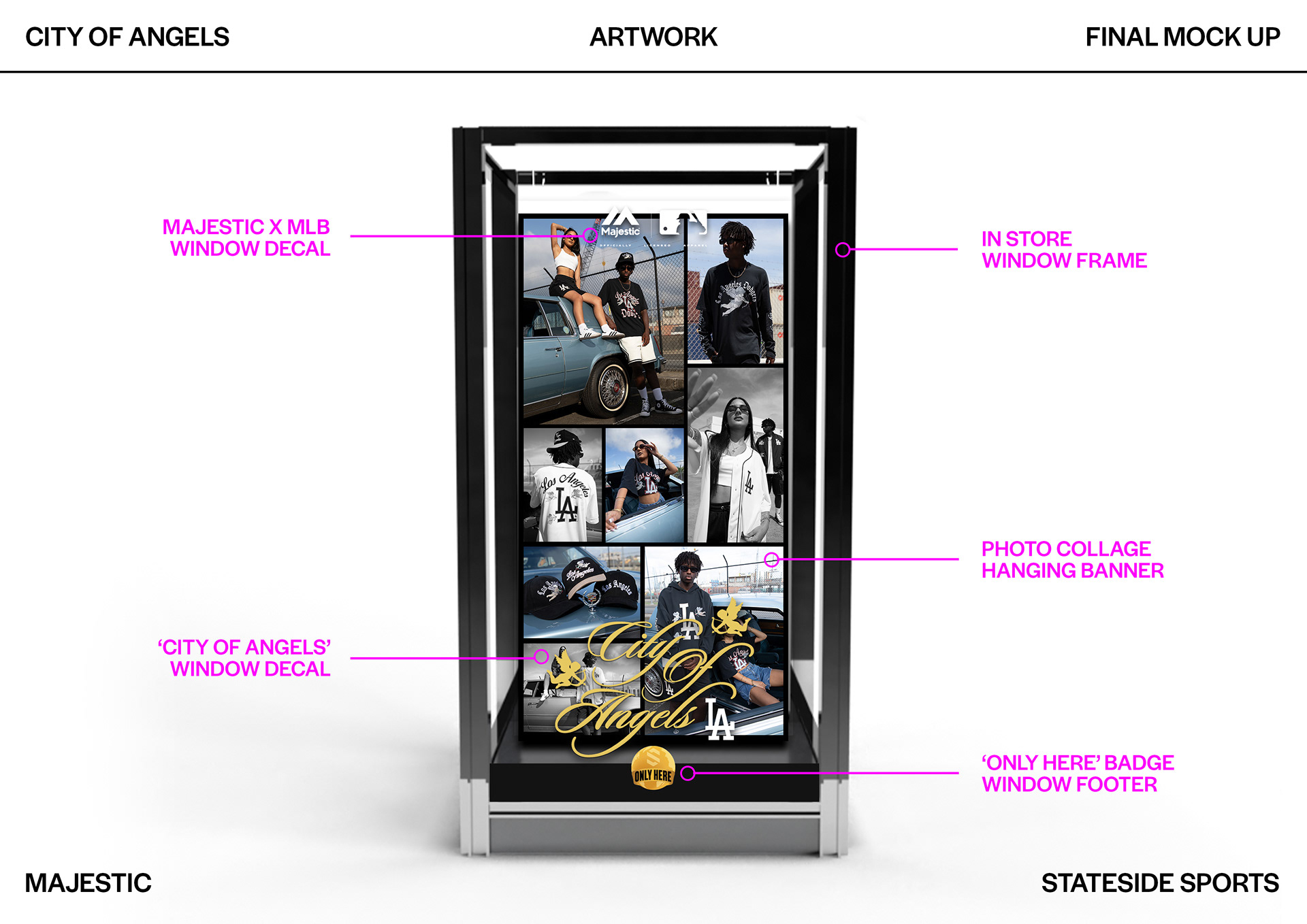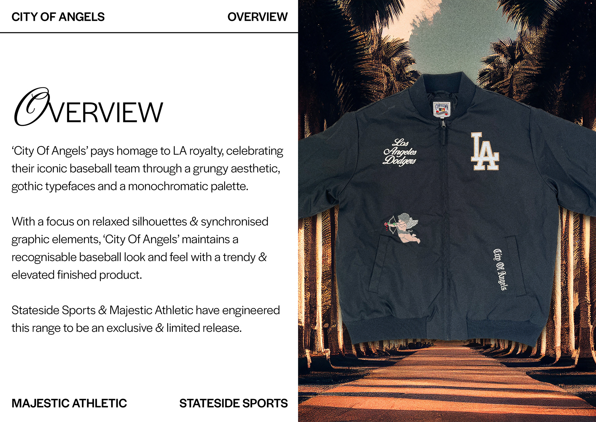 City Of Angels by Majestic is Stateside Sports' January 2024 campaign. Exclusive to Stateside Sports in the retail market, City Of Angels is a grungy contemporary collection featuring our best selling Los Angeles Dodgers product. This project was directed, concepted, designed, rendered, styled, executed & optimised for print by me for our nationwide 35 stores and our online store.
